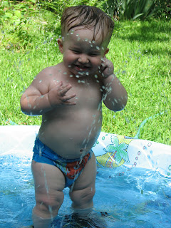 When we play with Eli sometimes we will count to 3 before throwing him in the air or tickling him or whatever is about to happen. He has caught on to this and when he wants something to happen he will put one finger in front of his face and say "t-ree, two, t-ree" This particular time Eli was wanting Daddy to run through the pool.